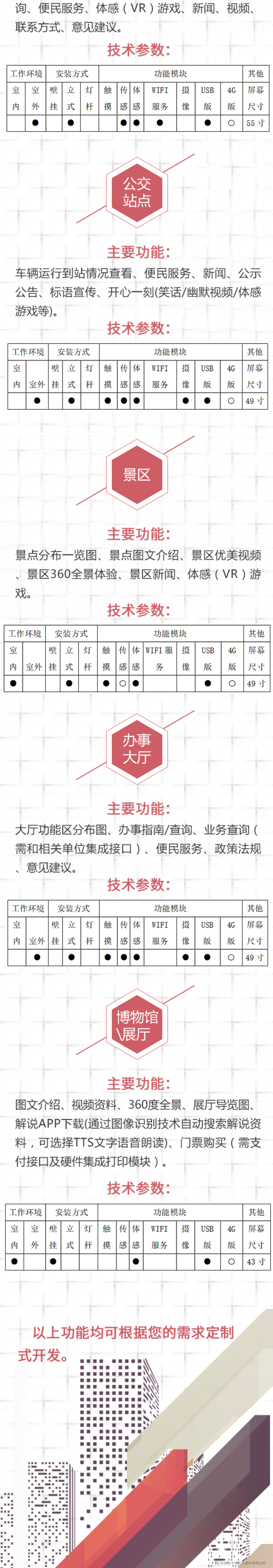 智慧終端的硬件設(shè)備分為室內(nèi),室外,立式,壁掛,燈桿等多種展示形式,使用場景不同,功能參數(shù)也不同,觸摸、體感、WIFI服務(wù)等可自由定制。其外觀設(shè)計(jì)美觀大方,采用鋼化玻璃鏡面,寬視角、高亮度工業(yè)級液晶屏及鋁型材外框。具有低功耗,超長時間穩(wěn)定運(yùn)行的特點(diǎn),支持7*24小時不間斷工作,支持全高清1920*1080P視頻播放及flash動畫播放,兼容主流視頻格式,圖片、文字同步播放。操作簡單,插電即應(yīng)用。