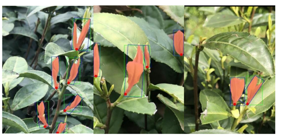 基于深度學(xué)習(xí)的圖像分割檢測模型,采集了西湖區(qū)龍井茶葉的采摘期圖像,構(gòu)建了嫩芽采摘定位模型,能夠?qū)崿F(xiàn)高效的帶采摘區(qū)域的定位和嫩芽區(qū)域的準確分割,結(jié)合雙目相機實現(xiàn)采摘點的位置和深度信息提取。該結(jié)果輔助靈活